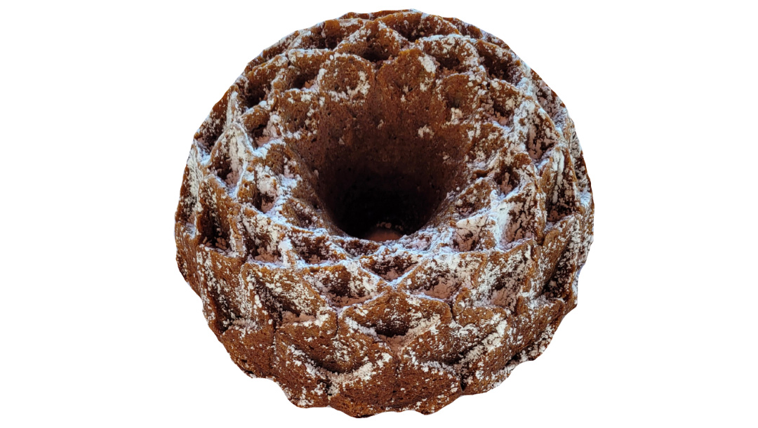A fluffy moist Bundt cake with hints of chocolate and topped with powdered sugar